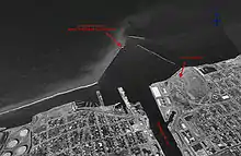 The caisson contains a large basement and is penetrated by double steel doors at the south where a tender may be landed to transfer personnel or supplies and a steel door at the west, leading to the breakwater. Recessed ladders are found at both elevations for access to the doorways and deck above.