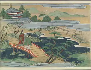 Urashima and Otohime cross a bridge in the kingdom under the sea. Japanese painting, late 16th or early 17th century