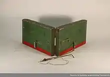 The otter may have multiple different designs. Otter boards used in bottom trawling are based on a similar principle of design. The design takes advantage of the shearing effect achieved when the board is positioned at an oblique angle to the current. The effect is reminiscent of that of a kite in the wind.[2][1] Different designs are found in Switzerland, the nordic countries, California and Japan. Most commonly the traditional board was made by wood, and had a length about two feet, a width of 6 inches and less than an inch thick. To enable it to float in an upright position it was equipped with metal weights made of lead or iron.[3] The correct amount of weights allows the board to float with only an inch or two above the surface. Snells, bated with flies or spoons are placed at intervals along the line. The snells would have different lengths due to the depth of which the line would float in the water. the longest snell would have been closest to the board, and the shortest closest to the fisherman.[3] In Britain fishing with an otter was forbidden by the Salmon Fishery Act 1861, and this may have been one of the reasons why British anglers introduced it to Norway. The first ban on the device in Norway was imposed in 1870 an it was increasingly forbidden throughout the end of the century.[3]