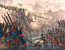 The Ottomans decided to conquer Venetian Cyprus and on 22 July 1570, Nicosia was besieged; 50,000 Christians died, and 180,000 were enslaved.[74] On 15 September 1570, the Ottoman cavalry appeared before the last Venetian stronghold in Cyprus, Famagusta. The Venetian defenders would hold out for 11 months against a force that would come to number 200,000 men with 145 cannons; 163,000 cannonballs struck the walls of Famagusta before it fell to the Ottomans in August 1571. The Siege of Famagusta claimed 50,000 Ottoman casualties.[75] Meanwhile, the Holy league consisting of mostly Spanish and Venetian fleets won a victory over the Ottoman fleet at the Battle of Lepanto (1571), off southwestern Greece; Catholic forces killed over 30,000 Turks and destroyed 200 of their ships.[76] It was a startling, if mostly symbolic,[77] blow to the image of Ottoman invincibility, an image which the victory of the Knights of Malta over the Ottoman invaders in the 1565 Siege of Malta had recently set about eroding.[78] The battle was far more damaging to the Ottoman navy in sapping experienced manpower than the loss of ships, which were rapidly replaced.[79] The Ottoman navy recovered quickly, persuading Venice to sign a peace treaty in 1573, allowing the Ottomans to expand and consolidate their position in North Africa.[80]