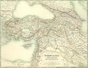The Crimean War (1853–1856) was part of a long-running contest between the major European powers for influence over territories of the declining Ottoman Empire. The financial burden of the war led the Ottoman state to issue foreign loans amounting to 5 million pounds sterling on 4 August 1854.[118][119] The war caused an exodus of the Crimean Tatars, about 200,000 of whom moved to the Ottoman Empire in continuing waves of emigration.[120] Toward the end of the Caucasian Wars, 90% of the Circassians were ethnically cleansed[121] and exiled from their homelands in the Caucasus and fled to the Ottoman Empire,[122] resulting in the settlement of 500,000 to 700,000 Circassians in Turkey.[123][124][125] Some Circassian organisations give much higher numbers, totalling 1–1.5 million deported or killed. Crimean Tatar refugees in the late 19th century played an especially notable role in seeking to modernise Ottoman education and in first promoting both Pan-Turkism and a sense of Turkish nationalism.[126]