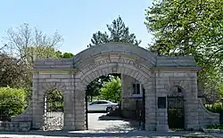 An ornate receiving vault was built in the cemetery in 1887. It is composed of red brick with terra cotta panels. It was designed in the Gothic Revival style. A wrought iron fence was put up along Court Street just after the vault was built. The Edgerly Gateway provides the main entrance into the cemetery. The limestone arch was built in the classical style of a Triumphal Roman arch in 1904.[2] Two years later the combination office and chapel building was built in the Gothic Revival style. It was dedicated to the Union soldiers and sailors who fought in the American Civil War. The building features arched windows and crenelated roofline.