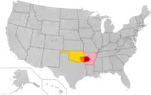 The Ouachita Mountains (/ˈwɒʃɪtɔː/), simply referred to as the Ouachitas, are a mountain range in western Arkansas and southeastern Oklahoma. They are formed by a thick succession of highly deformed Paleozoic strata constituting the Ouachita Fold and Thrust Belt, one of the important orogenic belts of North America.[3] The Ouachitas continue in the subsurface to the northeast, where they make a poorly understood connection with the Appalachians and to the southwest, where they join with the Marathon uplift area of West Texas.[3] Together with the Ozark Plateaus, the Ouachitas form the U.S. Interior Highlands.[4] The highest natural point is Mount Magazine at 2,753 feet.[2][5]