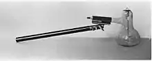 An Oudin coil, also called an Oudin oscillator or Oudin resonator, is a resonant transformer circuit that generates very high voltage, high frequency alternating current (AC) electricity at low current levels,[1][2][3] used in the obsolete medical field of electrotherapy around the turn of the 20th century.[4] It is very similar to the Tesla coil, with the difference being that the Oudin coil was connected as an autotransformer.[2][5] It was invented in 1893 by French physician Paul Marie Oudin[6] as a modification of physician Jacques Arsene d'Arsonval's electrotherapy equipment[7][8] and used in medical diathermy therapy as well as quack medicine until perhaps 1940. The high voltage output terminal of the coil was connected to an insulated handheld electrode which produced luminous brush discharges, which were applied to the patient's body to treat various medical conditions in electrotherapy.[4]