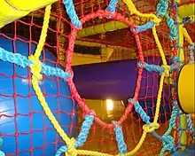 The out of bounds area in indoor playgrounds is an enclosed space usually located either aside tunnels, under a slide or stairs, or under a twirling slide. These are often restricted areas for maintenance access only. Usually one of the out of bounds areas of the indoor playground houses an electrical indoor power generator connected by wiring and cords,[1] usually to only be accessed by maintenance workers and staff only. These restricted areas are easily accessible by children, especially when the zipper to the space is open. The cover could be of various color, and is made out of either playground netting or the materials for one of the climb tunnels (a square patterned netting).