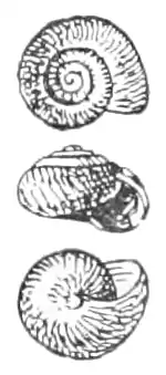 The shell of this species is perforate, trochoid, thin, shining, pellucid and dark corneous.[1] The spire is depressed.[1] The apex is obtuse.[1] Sutures are linear and margined.[1] The shell has four whorls, that are increasing rather suddenly.[1] The last whorl is convex and a little inflated and it is twice as wide as the penultimate whorl.[1] Whorls are finely striated, decussated by microscopic spiral lines.[1] The last whorl is not descending and it is slightly excavated in the umbilical region.[1]