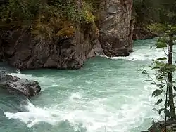 Overlander Falls is a waterfall on the Fraser River in Mount Robson Provincial Park, British Columbia, Canada. It is popular for kayakers. The falls are reached by a short walking trail which starts on the Yellowhead Highway 2 km (1.2 mi) east of the Mount Robson visitor centre. [2][3] The waterfall is named for the Overlanders expedition of 1862. A group of 175 men and 1 woman from Ontario travelled across the prairies and through the Rocky Mountains, intending to reach the Barkerville or Cariboo goldfields. Just west of Overlander Falls, the group split. About half continued down the Fraser River, eventually reaching Barkerville in late fall of 1862, but over a year had elapsed since Billy Barker's gold strike and there were no claims left to stake. The other half abandoned their dreams of gold and rafted down the North Thompson River to Fort Kamloops. [4]