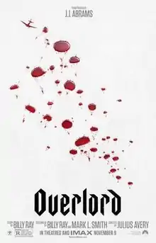 Overlord is a 2018 American alternate history action horror film[4][5][6] directed by Julius Avery and written by Billy Ray and Mark L. Smith. It stars Jovan Adepo, Wyatt Russell, Mathilde Ollivier, John Magaro, Gianny Taufer, Pilou Asbæk, Bokeem Woodbine and Iain De Caestecker.[7] The film was produced by J. J. Abrams, through his Bad Robot Productions banner, and Lindsey Weber.[8][9] The plot follows several American soldiers who are dropped behind enemy lines the day before D-Day and discover secret Nazi experiments.