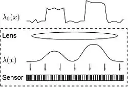 The oversampled binary image sensor is reminiscent of photographic film. Each pixel in the sensor has a binary response, giving only a one-bit quantized measurement of the local light intensity. At the start of the exposure period, all pixels are set to 0. A pixel is then set to 1 if the number of photons reaching it during the exposure is at least equal to a given threshold q. One way to build such binary sensors is to modify standard memory chip technology, where each memory bit cell is designed to be sensitive to visible light.[4] With current CMOS technology, the level of integration of such systems can exceed 109~1010 (i.e., 1 giga to 10 giga) pixels per chip. In this case, the corresponding pixel sizes (around 50~nm [5]) are far below the diffraction limit of light, and thus the image sensor is oversampling the optical resolution of the light field. Intuitively, one can exploit this spatial redundancy to compensate for the information loss due to one-bit quantizations, as is classic in oversampling delta-sigma conversions.[6]