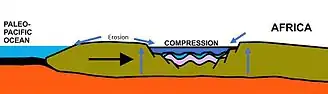 The pull-apart basin was then compressed when the Congo Craton was forced back together in the formation of the Gondwana supercontinent. This caused extensive uplift of the Owambo Basin edges and deepening of the basin's center(see Image 4), resulting in a massive erosional event that formed the Mulden Group (600-560 Ma). These three groups (Nosib, Otavi, and Mulden) compose the sedimentary package known as the Damara Supergroup.[5]