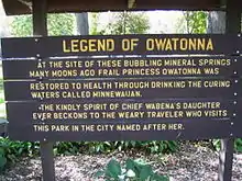 Owatonna was first settled in 1853 around the Straight River. The community was named after the Straight River,[6] which in the Dakota language is Wakpá Owóthaŋna. A popular, but apocryphal, story is that the town is named after "Princess Owatonna," the daughter of a local Native American chief who was supposedly healed by the magic waters of a nearby spring.[7] The earliest the Owatonna area was settled was in 1854 and platted in September 1855, but it was incorporated as a town August 9, 1858, then as a city on February 23, 1865.[6]