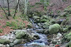 The Owendoher rises in two main branches. The larger branch flows from Glendoo / Glencullen valley, and meets the second, in turn formed from two streams, one sometimes called Kilakee Stream, from the slopes of Killakee Mountain, and the other Glendoo Stream, from west of Glendoo Mountain. The two branches merge near Rockbrook Cemetery, along with another small stream from Woodbrook and Piperstown, and the Owendoher flows north to Ballyboden, and on to Rathfarnham, receiving the Whitechurch Stream.