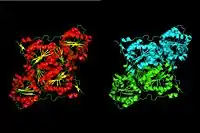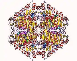 Oxalyl-CoA decarboxylase is tetrameric, and each monomer consists of three α/β-type domains.[13] The thiamine diphosphate-binding site rests on the subunit-subunit interface between two of the domains, which is commonly seen in its class of enzymes. Oxalyl-CoA decarboxylase is structurally homologous to acetolactate synthase found in plants and other microorganisms, but OXC binds ADP in a region that is similar to the FAD-binding site in acetolactate synthase.[14][15]