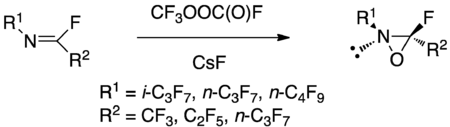 With highly electron withdrawing perfluoroalkyl substituents, oxaziridines exhibit reactivity more similar to that of dioxiranes than typical oxaziridines.[19] Notably, perfluoroalkyloxaziridines hydroxylate certain C-H bonds with high selectivity. Perfluorinated oxaziridines may be synthesized by subjecting a perfluorinated imine to perfluoromethyl fluorocarbonyl peroxide and a metal fluoride to act as an HF scavenger.[19]