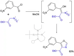 - In one reported oxazole synthesis the reactants are a nitro-substituted benzoyl chloride and an isonitrile:[5][6]
