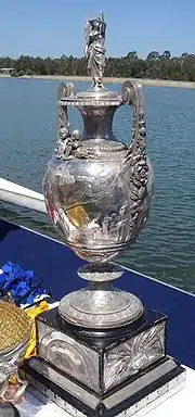 The trophy was donated in 1893 by Old Blues of the Universities of Oxford and Cambridge.[1] The original boat race was conducted over a 'Thames Putney Mortlake' equivalent course, which varied between 2 miles and 3+1⁄2 miles depending on location and conditions.