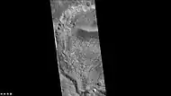 Eos Chasma with a Mensa, a flat topped prominence with cliff-like edges, as seen by THEMIS. In many places rock layers are visible.
