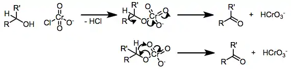 Chromate esters are implicated in these reactions. The chromate ester decomposes to the aldehyde or carbonyl by transfer of a alpha proton. Large kinetic isotope effects are observed.[4]