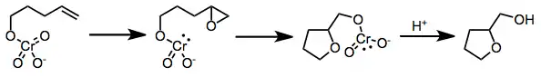 Oxidative cyclizations of olefinic alcohols to cyclic ethers may occur via [3+2], [2+2],[7] or epoxidation mechanisms. Insights into the mechanism is provided by structure-reactivity, implicating direct epoxidation by the chromate ester.[8] Subsequent epoxide opening and release of chromium leads to the observed products.