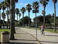 The park is located along the California Coastal Trail and the Pacific Coast Bicycle Route.[3] The park includes palm tree lined pathways and a bike/walking path connecting the communities of Oxnard Shores and Channel Islands Beach.[4] There is also an easy bike/walking connection to Channel Islands Harbor. Oxnard Beach Park includes two barbecue areas with a capacity of 200 occupants, each with a public sink, table, and a large grill. Activities include beachcombing, walking, and ocean swimming.[5] The park was designed to protect the sand dunes between the beach and grass picnic area.[6]