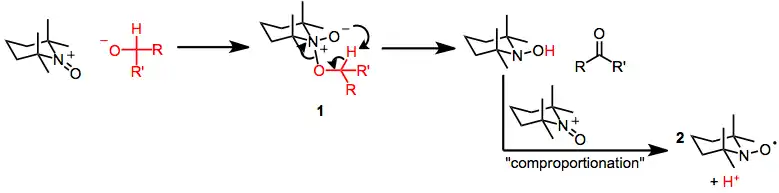 Under strongly basic conditions, the deprotonated substrate reacts with the N-oxyammonium species. Attack of the substrate alkoxide on either nitrogen or oxygen may occur, although the former is believed to operate on the basis of on observations of oxidations of N-alkoxy amines (which, presumably, proceed via intermediate 1).[7] Comproportionation of the reduced product (a hydroxylamine) with the oxoammonium ion competes with oxidation; thus, an excess of the oxidizing agent is often required.