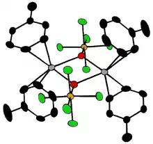 [AgOTeF5(C6H5CH3)2]2 molecule. Colours: black – C, green – F, red – O, brown – Te, grey – Ag.[16] Hydrogen atoms are not shown in this picture.