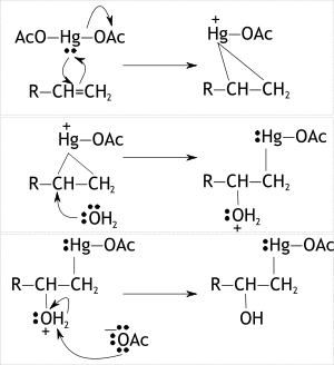 The oxymercuration reaction is an electrophilic addition organic reaction that transforms an alkene into a neutral alcohol. In oxymercuration, the alkene reacts with mercuric acetate (AcO–Hg–OAc) in aqueous solution to yield the addition of an acetoxymercury (HgOAc) group and a hydroxy (OH) group across the double bond. Carbocations are not formed in this process and thus rearrangements are not observed. The reaction follows Markovnikov's rule (the hydroxy group will always be added to the more substituted carbon) and it is an anti addition (the two groups will be trans to each other).[2][3][4]