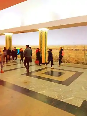 Oybek is a station of the Tashkent Metro on Oʻzbekiston Line. The station was opened on 8 December 1984 as part of the inaugural section of the line, between Alisher Navoiy and Toshkent.[1] It is named in honor of the poet known as Aibek. For the first time in Tashkent underground at this station applied column-type platform using earthquake-resistant monolithic structures. Columns station covered with reddish marble and decorated with a ceramic ornament. On the side walls of the stairs that go down to the platform, decorated with panels on the theme based on the works of Oybek as book pages. On one of them depicts the writer. When finishing the station it is widely used in marble, granite, ceramics and other materials.