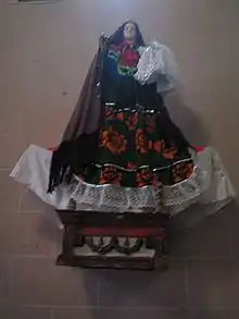 Two blocks east of the Plaza Chica is the most important church in Pátzcuaro, the Basilica of Nuestra Señora de la Salud.[13] This church was built by Vasco de Quiroga over a pre-Hispanic ceremonial site to function as the Cathedral of Michoacán. Vasco de Quiroga's original project was ambitious, with five naves surrounding a cupola, but the Spanish Crown thought the project inappropriate and only one of the naves was built.[1] The church served as the Cathedral until 1850, when that function was moved to Valladolid (now Morelia). This church was designated a basilica in 1924.[13] The facades have been modified since it was built at the end of the 19th century, which is why it now has a Neoclassical appearance. The inside has a roof decorated to look like a vault but it is really a flat roof. The image here is the Virgin of the Immaculate Conception that originally was in the Hospital of Santa Marta.[6] Now called "Our Lady of Health", it is made with corn-stalk paste and honey that was created in the 16th century. The remains of Vasco de Quiroga are interred here. This basilica is visited every day, but especially on the eighth day of every month to pay homage to the region's patroness.[7]