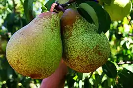 Pêra Rocha (Portuguese pronunciation: [ˈpeɾɐ ˈʁɔʃɐ]; literally "rock pear",[1]) is a native Portuguese variety of pear. The earliest account of the Rocha variety dates from 1836, in the Sintra municipality. This variety was casually obtained from a seed, on Pedro António Rocha's farm.[2] The variety derives its name from his family name. The 'Rocha' pear is produced in several places in Portugal. The production area is over 100 km² and there are about 9,450 producers.[3]