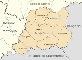 The Pčinja District (Serbian: Пчињски округ, romanized: Pčinjski okrug, pronounced [ptʃǐɲskiː ôkruːɡ]) is one of nine administrative districts of Southern and Eastern Serbia. It covers the southern part of Serbia, bordering the disputed territory of Kosovo, along with Bulgaria and North Macedonia. Its administrative center is the city of Vranje.