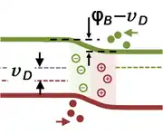 A forward bias separates the two bulk half-occupancy levels by the amount of the applied voltage, which lowers the separation of the p-type bulk band edges to be closer in energy to those of the n-type. As shown in the diagram, the step in band edges is reduced by the applied voltage to φB−vD. (The band bending diagram is made in units of volts, so no electron charge appears to convert vD to energy.)