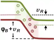 In reverse bias the occupancy level for holes again tends to stay at the level of the bulk p-type semiconductor while the occupancy level for electrons follows that for the bulk n-type. In this case, the p-type bulk band edges are raised relative to the n-type bulk by the reverse bias vR, so the two bulk occupancy levels are separated again by an energy determined by the applied voltage. As shown in the diagram, this behavior means the step in band edges is increased to φB+vR, and the depletion region widens as holes are pulled away from it on the p-side and electrons on the n-side.