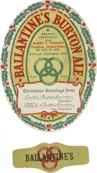 - A Burton ale, never commercially sold, it was brewed to be given as a gift to Ballantine distributors, executives, and VIPs. It was a strong brew in the barleywine style, aged from 10 to 20 years in wood prior to bottling. Surviving unopened bottles are still bought, sold, and traded to this day among collectors, more than 60 years after being brewed. Because of the long aging and generous hopping as well as an ABV content comparable to barleywines, the beer had remarkable keeping qualities. Still, it could be argued that since the beer was already long aged prior to bottling, it was probably already at its peak when finally bottled. Reports of modern-day tastings indicate that properly handled vintage bottles of this unique beer can still yield a complex (though somewhat faded) taste experience.[19]