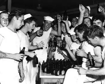 - Bottles of Ballantine Beer, the lager, are featured prominently in a picture of a group of sailors celebrating VJ Day at the Naval Air Station(NAS) Beaufort, South Carolina.[26]