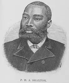 P. H. A. Braxton (September 22, 1852 – March 7, 1900) was a preacher and politician in Virginia and Maryland. During the Reconstruction Era, Braxton was a county constable in King William County, Virginia and later a United States Custom House collector in Low Cedar Point, Westmoreland County, Virginia. In 1879 he became pastor of Calvary Baptist Church in Baltimore, a position he held for about twenty years. He was active in fighting for civil rights and educational issues.