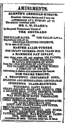 1866 newspaper advertisement for Barnum's American Museum located on Ann Street in Manhattan