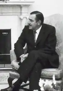 At age 30, Botha was elected head of the National Party Youth in 1946, and two years later was elected to the House of Assembly as representative of George in the southern Cape Province in the general election which saw the beginning of the National Party's 46-year tenure in power. His opponent in the 1948 election was JP Marais from the United Party. In 1958 Botha was appointed Deputy Minister of Internal Affairs by Hendrik Verwoerd, and in 1961 was appointed to the new Department of Coloured Affairs and became Minister of Community Development.[5][6] In 1966, Botha was appointed Minister of Defence by Verwoerd and served under the government of John Vorster, upon Verwoerd's murder later that year. Under his 14 years in charge of the ministry, the South African Defence Force (SADF) reached a zenith, at times consuming 20% of the national budget, compared to 1.3% in 1968, and was involved in the South African Border War.[7] When Vorster resigned following allegations of his involvement in the Muldergate Scandal in 1978, Botha was elected as his successor by the National Party caucus, besting the electorate's favourite, 45-year-old Foreign Minister Pik Botha. In the final internal ballot, he beat Connie Mulder, the scandal's namesake, in a 78–72 vote.