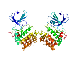 Ribosomal protein S6 kinase beta-1 (S6K1), also known as p70S6 kinase (p70S6K, p70-S6K), is an enzyme (specifically, a protein kinase) that in humans is encoded by the RPS6KB1 gene.[5][6] It is a serine/threonine kinase that acts downstream of PIP3 and phosphoinositide-dependent kinase-1 in the PI3 kinase pathway.[7] As the name suggests, its target substrate is the S6 ribosomal protein.[8] Phosphorylation of S6 induces protein synthesis at the ribosome.