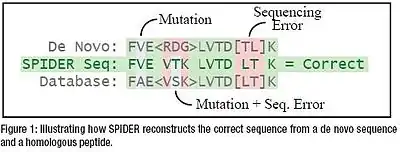SPIDER is a sequence tag based search tool within PEAKS, which deals with the possible overlaps between the de novo sequencing errors and the homology mutations. It reconstructs the real peptide sequence by combining both the de novo sequence tag and the homolog, automatically and efficiently.[2]