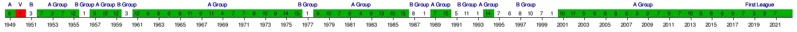 | 2001–02 | A Group | 11 | 40 | 12 | 11 | 17 | 47 | 51 | 35* | Round of 16 | Relegation Group |