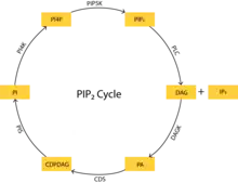 PIP2 cycle involves steps of chemical reactions characterized by various enzymes. First hydrolysis of PIP2 molecules by activated phospholipase C leads to formation of diacylglycerol and inositol trisphosphate. These two are themselves important second messengers.[4] Diacylglycerol further converted into phosphatidic acid (PA) by DAGK enzyme. Furthermore, CDP-diacylglycerol synthetase uses CTP to create cytidine diphosphate diacylglycerol from PA.[5][6] Generated CDP-DAG then condensed to PI by phosphatidylinositol synthase.[7] This PI is then phosphorylated to PI4P and back to PIP2 via action of PI4K and PIP5K[8]