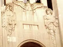 - Entrance features 44-foot arch, African mahogany, and green terrazzo floor.[2]