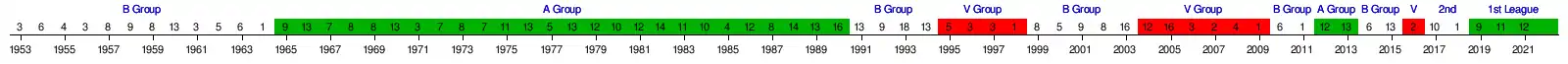 Botev's longest continuous period in the top tier was 26 consecutive seasons between 1964 and 1990. The club's highest ever league finish came in 1970–71 when it finished third in the top flight.