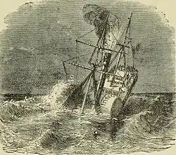 After striking the rock, the captain ordered the engines into reverse, with the hope of making to the shore before she sank. However, the ship was quickly inundated with water and it sank in 10 fathoms (60 ft; 18 m) of water,[17] about 3 miles (4.8 km) away from the mainland.[18] The two lifeboats were lowered during the confusion of the sinking, but both were swamped with water. The first mate had talked with the captain at this time, and the captain was upset at the launching of the lifeboats without his knowledge or guidance. The mate stated that the captain's last words were "Alas, alas, we are all going to the bottom."[19] At 5:00 am of 20 July, the paddle steamer Martello arrived at the scene of the sinking and picked up some survivors as well as at least six bodies.[20] After staying at the scene for several hours, the Martello sailed to Leith and took the bodies with her, as well as the survivors, two of whom, Bailey (or Baillie) and Hildyard, were passengers.[21] The other four survivors were from her crew; the mate, the engineer, the carpenter and one seaman.[18] One of those who drowned, was the renowned 19th-century actor Edward William Elton. After his death was announced, several appeals to raise money for his family were launched, which had Charles Dickens in an overseer role.[22]