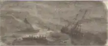 Wreck of the Queen Victoria in a snowstorm on the Howth Rocks, between 2 and 3 o'clock on Tuesday Morning, 15 February 1853, showing the paddle steamer Roscommon, chartered by the Chester and Holyhead Railway Company attempting a rescue