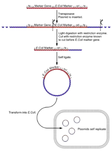 - Random transposition occurs, inserting the gene of interest and reporter gene.