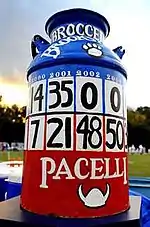 Pacelli's biggest rival is Brookstone High School, located in North Columbus (8 miles (13 km) north of Pacelli's Midtown campus). Although Pacelli plays Brookstone in all of their sports, the most popular rivalry is their yearly football game, dubbed the "Battle for the Jug".[17][18] The winner of this game gets to keep the "Broocelli Jug" (a milk jug painted red and blue) at their campus for the next year, along with bragging rights. In 2013, Pacelli received the jug for the first time since 2004 in a 14–7 win.[19] The rivalry first began in 1972, and Brookstone leads the series 27–17–1.[20]