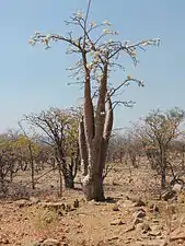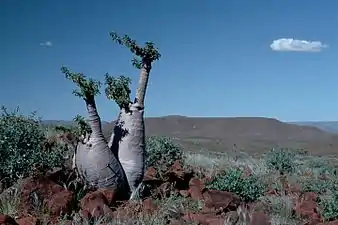 The bottle tree is an endemic species of Namibia and southern Angola where it occupies the semi-desert areas and dry bushvelds, usually along rocky hillsides. It is especially common in the Etendeka plateau of NE Namibia, where it can be seen growing in the basalt slopes.