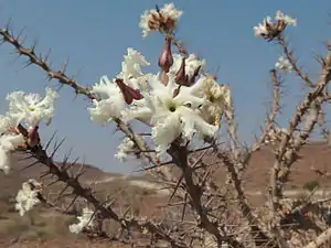 This species can be either a shrub or a tree up to 6 meters tall and is characterized by the thick bottle-shaped trunk, which is almost branchless until the top. The branches are few and covered by slender thorns up to 30 cm long. Leaves are oblong and are covered with short hairs on both surfaces. The flowers, shown below in detail, are present in the spring, when the tree is leafless. The white flowers, characteristic of the family Apocynaceae, cluster around the tips of the branches.
